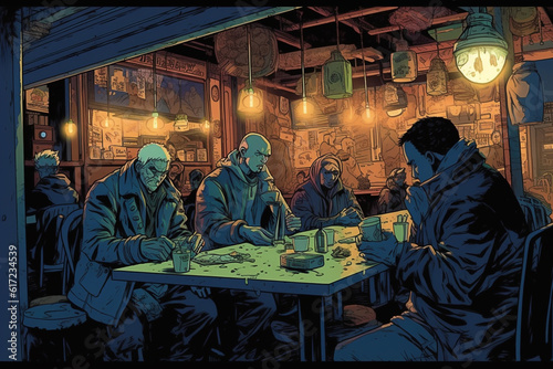 pub, dining room, dining table, furniture, indoor, table, eatery, adult, male, man, person, art, painting, urban, cafes, cafeteria, coat, factory, people, factory, canteen, environment, culture, object, material, economy, location, human being, place, nourishment, technology, humankind, architecture, building, traffic