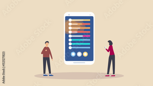 people, smartphone, interface, man, woman, mobile, device, technology, application, app, design, illustration, flat, graphic, vector, digital, communication, modern, style, minimalist, user, life events, tech, progress, control, setting, option, navigation, screen, display, buttons, circle, colours, gradient, person, standing