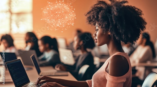 People use Laptops in Classroom Learning Neural Networks with Connected Dots Above. Female Focuses on Screen in Orange Toned Room with Associates