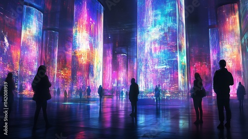 People Viewing Vividly Lit Cylinders Wide Shot Photo. AI Generated