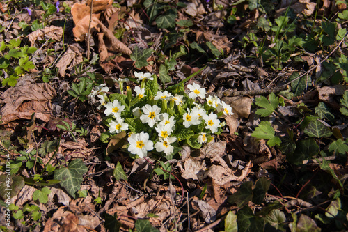 Perennial primrose or primula in the spring garden