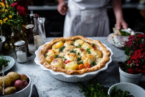 chicken, pie, flaky, crust, gold, creamy, filling, tender, savoury, dish, baked, comfort, food, potato, carrot, herb, sauce, rustic, kitchen, cooking, baking, fresh, ingredient, delicious, receipe, family, dinner, wholesome, culinary, art, seasonal, epicure, traditional, farmhouse, homemade, tool, colourful, vegetable, meal, warm, presentation, beautiful, herb, pot, styling, scene, process, natural