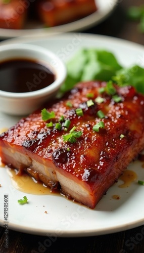 Perfectly crisped pork belly, glistening with rendered fat, served with a dark, glossy dipping sauce on a stark white plate , glistening, dark sauce, food styling