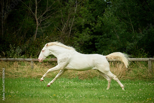 Perlino lusitano stallion at full speed in a field