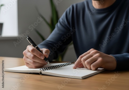 man, person, hand, writing, pen, notebook, spiral, paper, desk, wood, table, indoor, room, home, office, work, study, learning, note, note, journal, diary, planning, idea, thought, sharpened, concentration, detail, closeup, finger, arm, sleeve, shirt, blue, casual attire, adult, male, light, natural, background, plant, window, interior, comfortable, relaxed, thoughtful, process