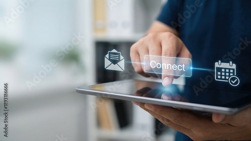Person Connecting Applications via Touchscreen with Email and Calendar Icons on Tablet