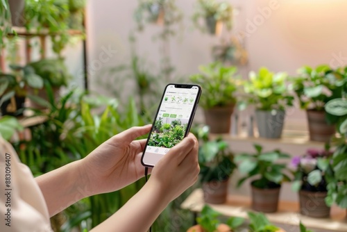 person effortlessly managing their smart indoor garden using a smartphone app, gardening solutions, application for growing plants at home, mobile phone screen in woman's hands