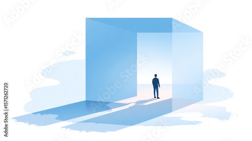 person, box, glasses, light, open, empty, space, future, perspective, vision, journey, opportunity, growth, forward, hope, pathway, abstract, modern, silhouette, blue, tranquil, calm, shadow, huge, immensity, lightness, simplicity, concept, entrance, geometric, large, interior, exterior, minimalist, hopeful, new, potential, bright, sky, cloud, shape, structure, crisp, clean, clear, simple, illustration, design