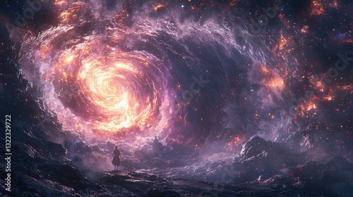 space, cosmos, nebula, galaxy, swirl, spiral, fire, cosmic, energy, universe, star, night, sky, mysterious, fantasy, mystical, magical, wonder, awe, person, figure, woman, silhouette, standing, landscape, rock, mountain, dark, purple, orange, red, vibrant, colours, light, glow, power, huge, infinite, deep, abstract, art, digital, illustration, concept, scene, view, background