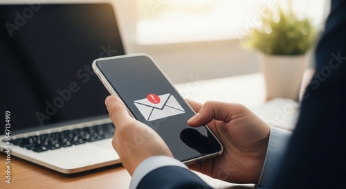 smartphone, mobile, phone, electronic mail, message, notification, alert, unread, communication, technology, digital, device, hand, holding, screen, icon, symbol, laptop, computer, work, business, connection, information, app, application, online, cyberspace, access, update, new, incoming, correspondence, contact, datum