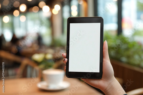 tablet, screen, hand, cafes, hot drink, blank, device, modern, interior, holding, technology, display, digital, space, wireless, connection, lifestyle, communication, portable, contraption, female, touch screen, showing, business, relaxation, background, blur, eatery, cup, information, online, cyberspace, application, website, marketing, social, media, advertisement, innovation, commerce