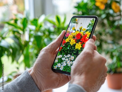 flower, smartphone, hand, greenery, indoor, nature, colourful, arrangement, vibrant, plant, photo, mobile, technology, device, closeup, display, screen, digital, garden, blossom, beauty, home, exposure, sharpened, detail, fresh, bloom, flora, seasonal, cheerful, bright, view, living, beautiful, enjoyment, hobby, interest, art, creative, capture, colours, yellow, red, white, flowerpot, design, interior, decor, peaceful