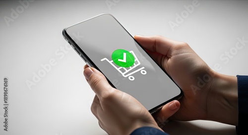 smartphone, phone, mobile, hand, holding, device, screen, display, shopping, cart, basket, checkout, purchase, buy, online, e-business, digital, transaction, order, confirmation, success, successful, checkmark, tick, green, icon, symbol, app, application, cyberspace, web, retail, store, market, consumer, client, payment, credit, debit, banking, finance, technology, communication, connectivity, wireless, modern, contemporary, contraption