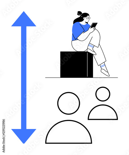 person, sitting, reading, tablet, block, comparison, technology, digital, education, communication, distance, scale, measurement, learning, media, interaction, profile, online, human relationships, metaphor, business, marketing, concept, abstract, web, smartphone, woman, girl, female, research, social, minimal, iconography, conceptual, graph, vector, illustration, icon, flat