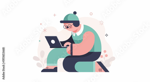 Person in hat and glasses focused on laptop, surrounded by abstract shapes