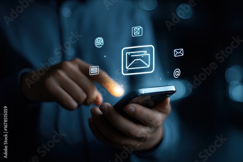 person, phone, electronic mail, icon, hand, touch, digital, communication, technology, mobile, interface, electronic mail, messaging, contact, message, inbox, outbox, sending, receiving, cyberspace, online, datum, network, virtual, light, blue, graphic, design, interaction, user, device, display, screen, business, modern, app