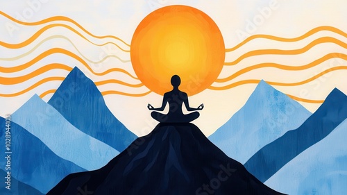 Person meditating on a mountain with a sun and mountains in the background.