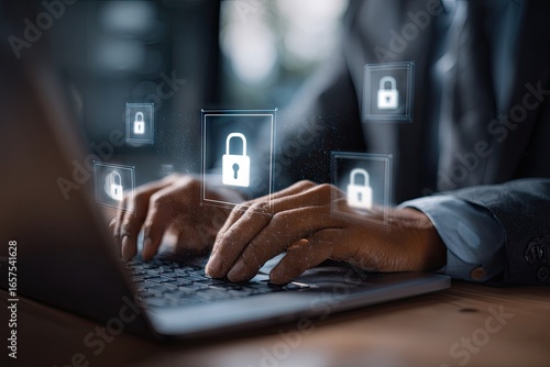 Person secures data on laptop, digital locks displayed