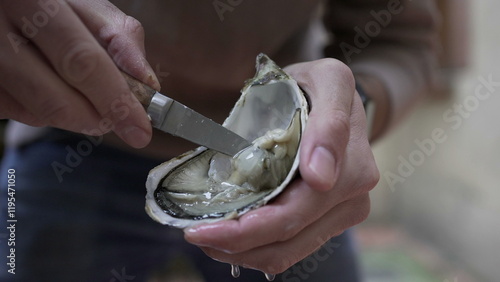 Person showing oyster to camera with knife