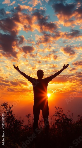 silhouette, person, sunset, cloud, orange, sky, sun, light, arm, open, nature, horizon, evening, dawn, dusk, freedom, outdoors, happy, celebrate, joy, hope, energy, vibrant, warm, backlit, outline, shadow, landscape, scenic, beautiful, majestic, tranquil, peaceful, sunlight, gold, fiery, inspiration, aspiration, gratitude, serenity, bright, glowing, rise, hugs, perspective, standing