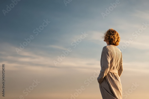 person, standing, alone, show, hand, gesture, inspiration, they, gaze, toward, horizon, scene, moment, introspection, highlighting, serene, expression, filled, hope, purpose, individual, dressed, comfortable, attire, stand, against, clean, background, feeling, freedom, possibility, sky, clear, painted, soft, hue, blue, warmth, new, beginning, sunlight