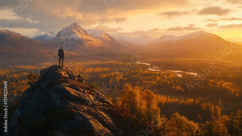 person, mountain, peak, vale, autumn, sunset, landscape, nature, scenic, view, gold, sunrise, fall, hill, tree, forest, wood, river, water, sky, cloud, orange, yellow, light, sun, travel, adventure, exploration, wilderness, scene, panorama, vista, majestic, tranquil, serene, calm, beautiful, gorgeous, stunning, amazing, incredible, breathtaking, spectacular