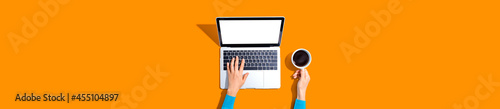 laptop, computer, technology, business, financial, marketing, finance, remote, work, job, home, distance, telework, meeting, accounting, account, online, shopping, research, office, tech, table, desk, working, concept, notebook, hand, woman, digital, flat, lay, minimal, simplicity, up high, overhead, view, top, background, shadow, orange, blue, hot drink, cup