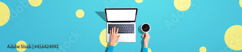 laptop, computer, technology, business, financial, marketing, finance, remote, work, job, home, distance, telework, meeting, accounting, account, online, shopping, research, office, tech, table, desk, working, concept, notebook, hand, woman, digital, flat, lay, minimal, simplicity, up high, overhead, view, top, background, shadow, yellow, blue, polka, dot, circle, hot drink, cup