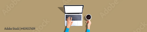 laptop, computer, technology, business, financial, marketing, finance, remote, work, job, home, distance, telework, meeting, accounting, account, online, shopping, research, office, tech, table, desk, working, concept, notebook, hand, woman, digital, flat, lay, minimal, simplicity, up high, overhead, view, top, background, shadow, beige, brown, blue, hot drink, cup