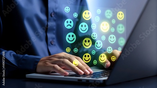 Person using laptop with positive feedback and customer satisfaction emojis displayed