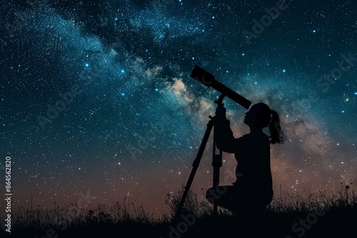 Person Using Telescope Under Starry Sky. Silhouette Photography. Astronomy and Stargazing Concept for Poster and Print.