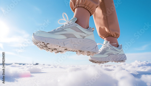 leg, sneaker, winter, snow, woman, sport, ice, cold, people, sk8, outdoors, fun, shoe, active, skate, person, leisure, walking, skater, jump, lifestyle, fitness, mountain, outside, sky