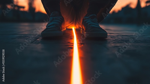 Person wearing sneakers stands above a radiant line of light in the evening photo