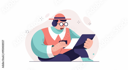 person, earphones, goggles, tablet, paper, reading, studying, learning, working, listening, focused, concentration, information, technology, digital, device, online, education, cognition, datum, research, analysis, communication, connection, entertainment, leisure, hobby, creativity, design, illustration, flat, cartoon, character, stylised, modern, simple, graphic, background, white, pink, blue, orange, purple, teal, red, hand, finger, gesture, activity