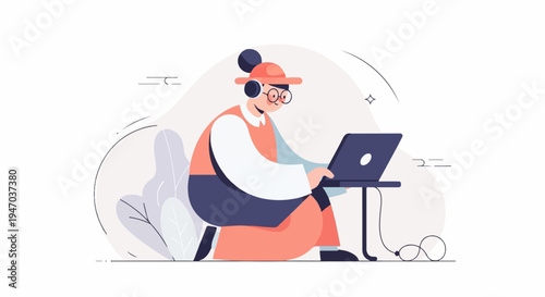 Person with headphones and glasses works on laptop, surrounded by abstract shapes