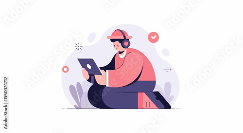 person, earphones, tablet, sitting, abstract, shape, plant, digital, technology, device, male, young, adult, modern, illustration, cartoon, character, creative, design, flat, graphic, colourful, purple, pink, white, background, isolated, content, communication, learning, entertainment, gaming, browsing, social, media, online, connected, information, user, life events, lifestyle, casual attire, hobby, leisure, sharpened, concentration, engagement, activity, interest