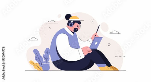 person, earphones, goggles, hat, laptop, tablet, outdoors, sitting, plant, cloud, abstract, illustration, digital, technology, work, study, learning, communication, connection, creative, design, modern, simple, flat, stylised, sharpened, concentration, information, online, casual attire, comfortable, relaxed, content, connected, cognition, education, user, interface, screen, device, creation, browsing, cyberspace, software, application, website