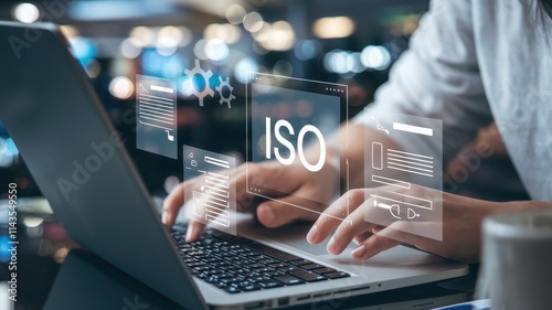laptop, iso, standard, person, working, technology, computer, digital, online, certification, compliance, quality, management, system, business, process, document, file, datum, information, interface, screen, keyboard, hand, finger, typing, network, security, software, application, design, development, project, task, goal, achievement, success, efficiency, improvement, innovation, progress