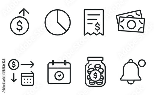 personal, budget, income, icon, expense, pie, receipt, bill, transaction, flow, calendar, event, savings, jar, alert, bell, linear, style, isolated, no, text
