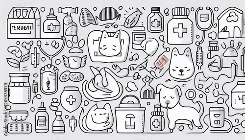 Pet veterinary clinic line icon set. Sick pet, animal, cat, dog for veterinarian sticker template. Doodle line style animal and character. Vector illustration.