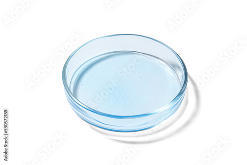 Petri dish with liquid on white background
