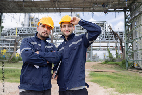 Petroleum engineers with hardhat pose at camera at oil refinery site