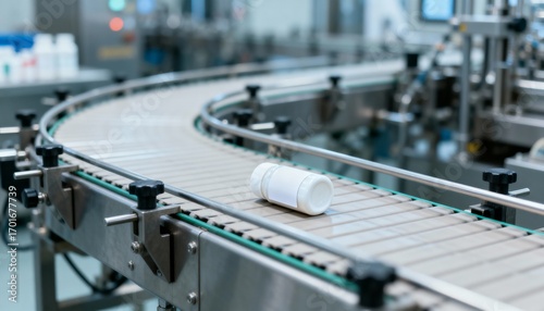 Pharmaceutical Production: White Plastic Bottle on Automated Conveyor Belt in a Modern Factory Setting