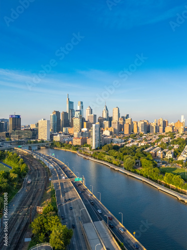 aerial, america, architecture, attraction, blue skies, building, business, car, city, city landscape, clear sky, commuter, downtown, drone, east coast, evening, financial district, golden hour, highway, iconic, infrastructure, landmark, landscape, metropolitan, modern, northeast, office, outdoors, panorama, panoramic, pennsylvania, philadelphia, river, scenic, skyline, skyscraper, skyscraper, summer, sunset, tour tourism, transportation, travel, us, urban, us, waterfront