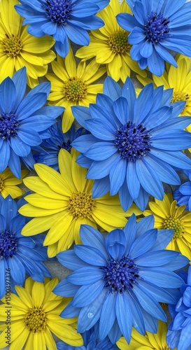 Photo Blue and Yellow Floral Arrangement Against a Neutral Background