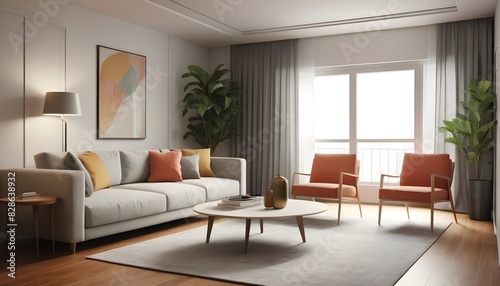 apartment, comfortable, decor, furniture, hall, home, interior, modern, pillow, render, room, sofa, wall, living, living room, three-dimensional, blue, beige, rug, pattern, pouf, bookcase, telescope, poster, vintage, rattan, indoor