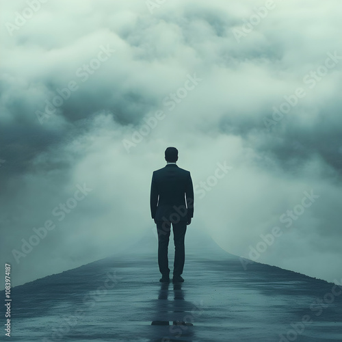 challenge, decision, path, hope, ambition, purpose, fear, goal, solitude, success, dream, silhouette, adventure, fantasy, atmosphere, suit, pathway, journey, backview, mist, uncertainty, dark, surreal, career, moody, mystery, leadership, road, walk, exploration, contemplation, standing, direction, man, business, concept, fog, achievement, abstract, alone, perspective, vision, future, unknown, discovery, cloud