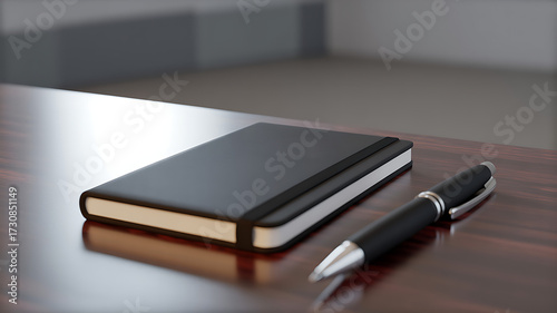 Photo of a closed black notebook with a pen rests on a wooden desk