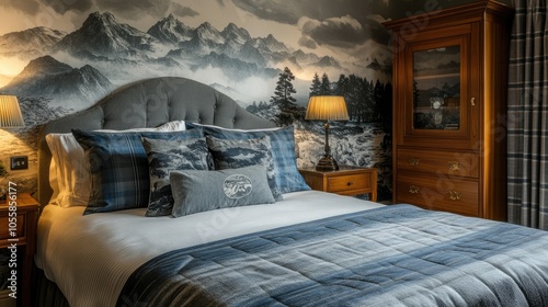 Photo of a cozy bedroom decorated with blue and grey bedding and mountain wallpaper.