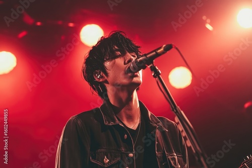 Photo of a man with dark hair and stubble, wearing a black denim jacket, singing into a microphone on stage in front of red lights.